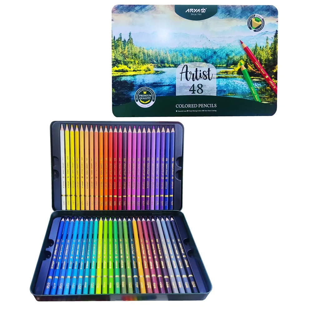 مدادرنگی آریا آرتیست 48 رنگ جعبه فلزی مغزی نرم و رنگ‌دهی بالا کیفیت بالا و قیمت اقتصادی مغزی نرم ببا قابلیت محوشوندگی مورد قبول طیف رنگی کامل و تناژژ رنگی هماهنگ با یکدیگر برای طراحی دقیق