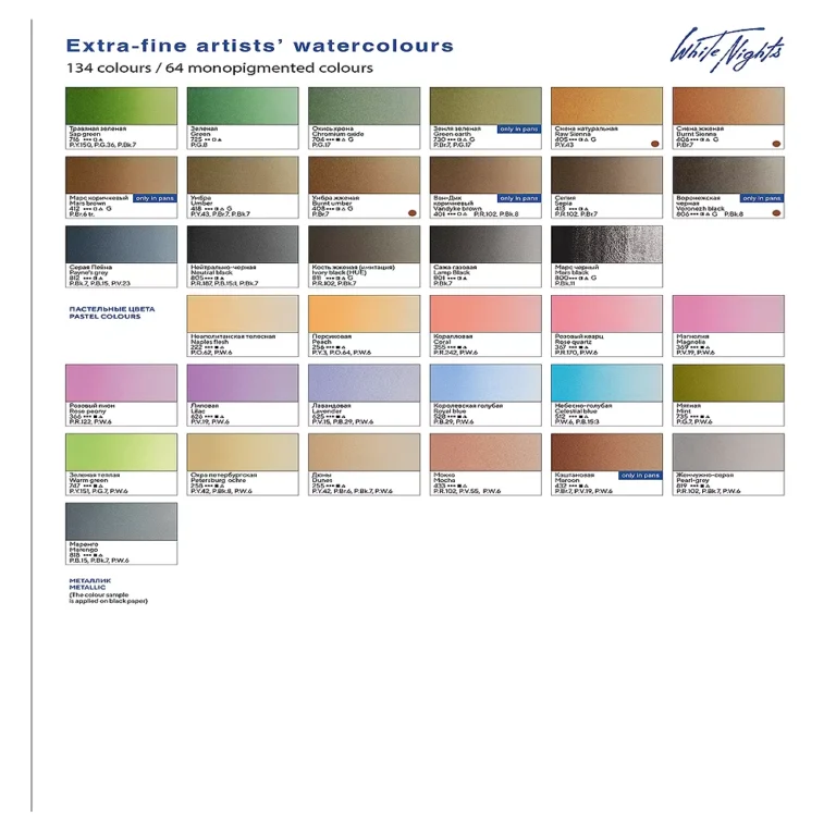 قرص آبرنگ سنپترزبورگ حجم رنگ هر قرص 2/5 میل ساخت روسیه رنگدانه ها با پیگمنت رنگی بسیار بالا تنوع رنگی استاندارد شامل رنگ های ساده و متالیک