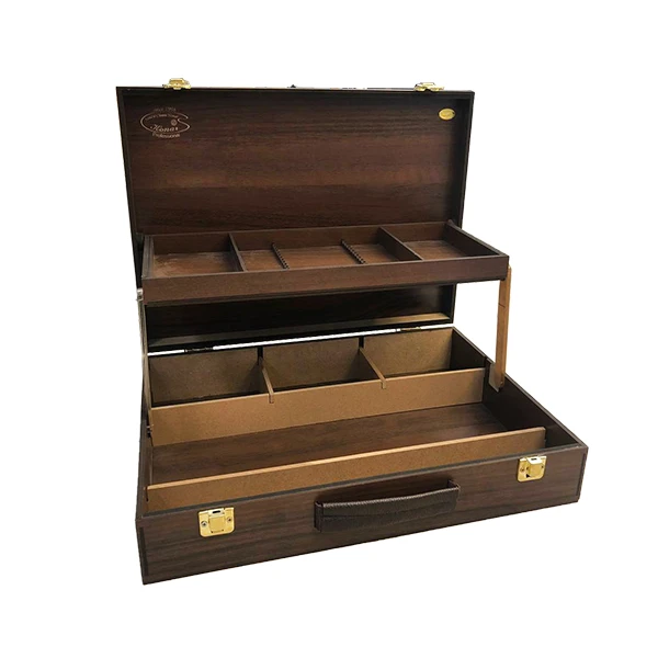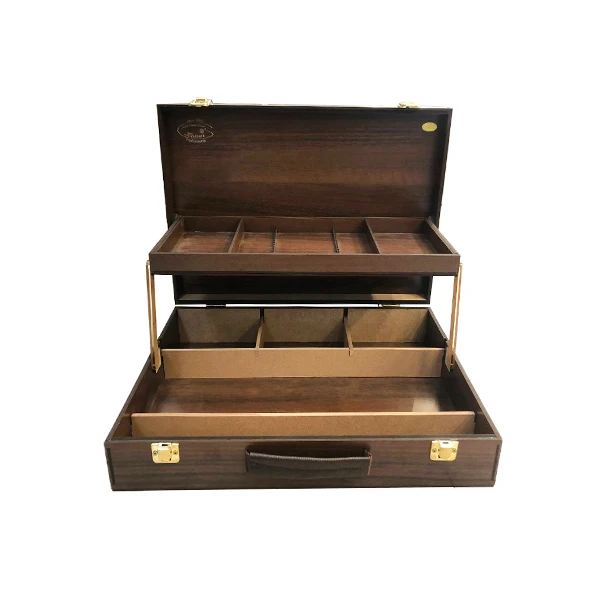 جعبه چوبی صنایع هنر دو طبقه نگدارنده قلمو ، رنگ ، مدیوم و انواع لوازم دو طبقه جای مداد و مدادرنگی طبقه دوم به صورت ریلی حرکت می کند